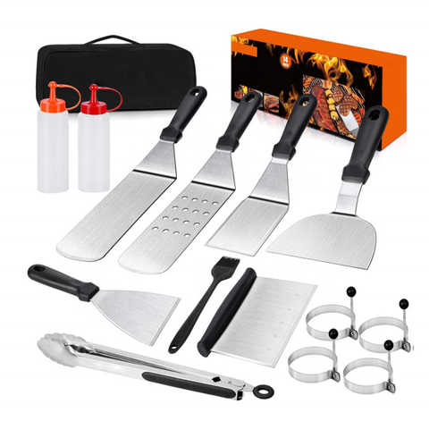 14 pezzi Set di spatole in acciaio inossidabile Kit di accessori per Barbecue lunghi in plastica lavabile in lavastoviglie per lo Chef del campo della griglia in Blackstone
